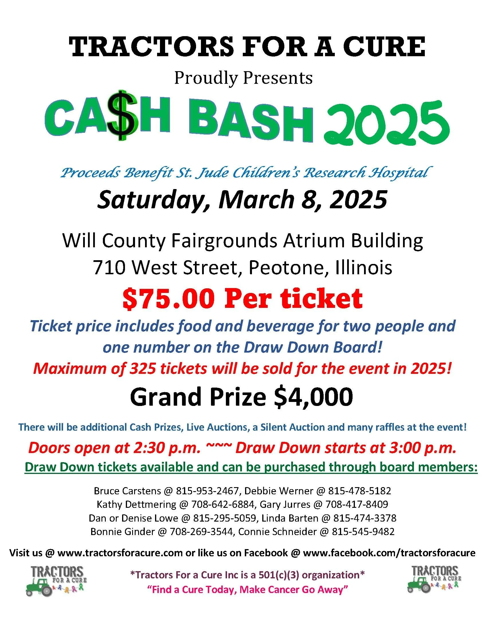 Our Cash Bash event will be held on Saturday, March 8, 2025 at the Will County Fairgrounds Atrium building located at the Will County Fairgrounds located at the corner of Peotone Wilmington Road and West Street in Peotone, Illinois. This event is a ticket only/private event. All the proceeds from this event are donated to St. Jude Children’s Hospital. For more information on the event, please check out our Facebook site at Tractorsforacure.